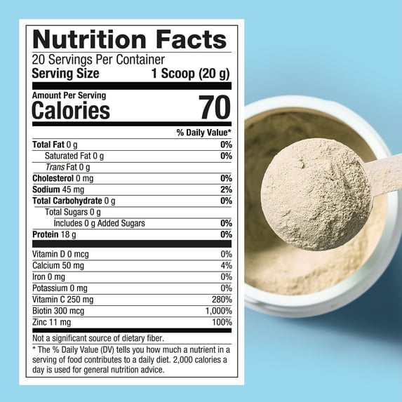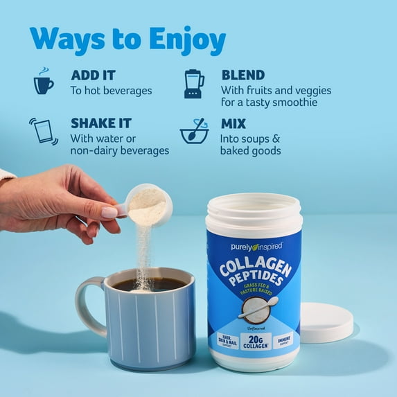 Purely Inspired Collagen Peptides Powder Unflavored delivers 20 grams of Collagen Peptides (Type I & III), 18 grams of Protein and 18 Amino Acids with at total of 90 Calories. Purely Inspired Collagen Peptides is also gluten and dairy free, contains no added sugar, is non-GMO, and supports a keto and paleo diet. Mix in a glass or shaker bottle with water, coffee, juice, smoothies, almond milk, oat milk or your drink of choice. It can also be added to oatmeal, cereal, snack bars, pancakes, waffles, soups and other hot or cold recipes. 20 Servings.