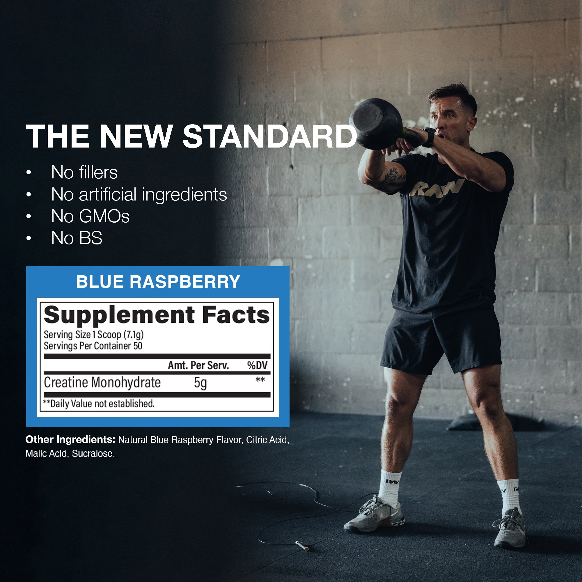 Creatine is a naturally occurring compound in the body that plays a critical role in the production of ATP, the primary source of energy for your muscles. RAW Nutrition’s Creatine Monohydrate powder delivers pure, high-quality creatine monohydrate to help increase muscle energy, strength, and endurance, so you can push harder and train longer. Creatine was one of the first sports nutrition supplements to ever hit the market, and there’s a reason it has withstood the test of time. This strength builder has been proven time and time again to enhance power output, becoming a staple in the world of weight training and laying the foundation for athletes to excel. Blue Raspberry is the refreshing explosion of flavor you need to power your cells and power up your workout. 50 servings. No Fillers. No Artificial ingredients. No GMOS. Formulated and trusted by 6X Olympia Champion Chris Bumstead.